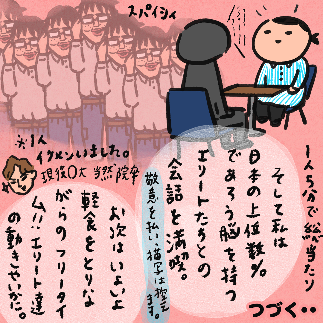 婚活パーティーに来ているものの、全体を見渡してもあまり前のめりの男性がいるようにも見えず、一番興味あることってもしかして研究・・?などと思ったりも・・