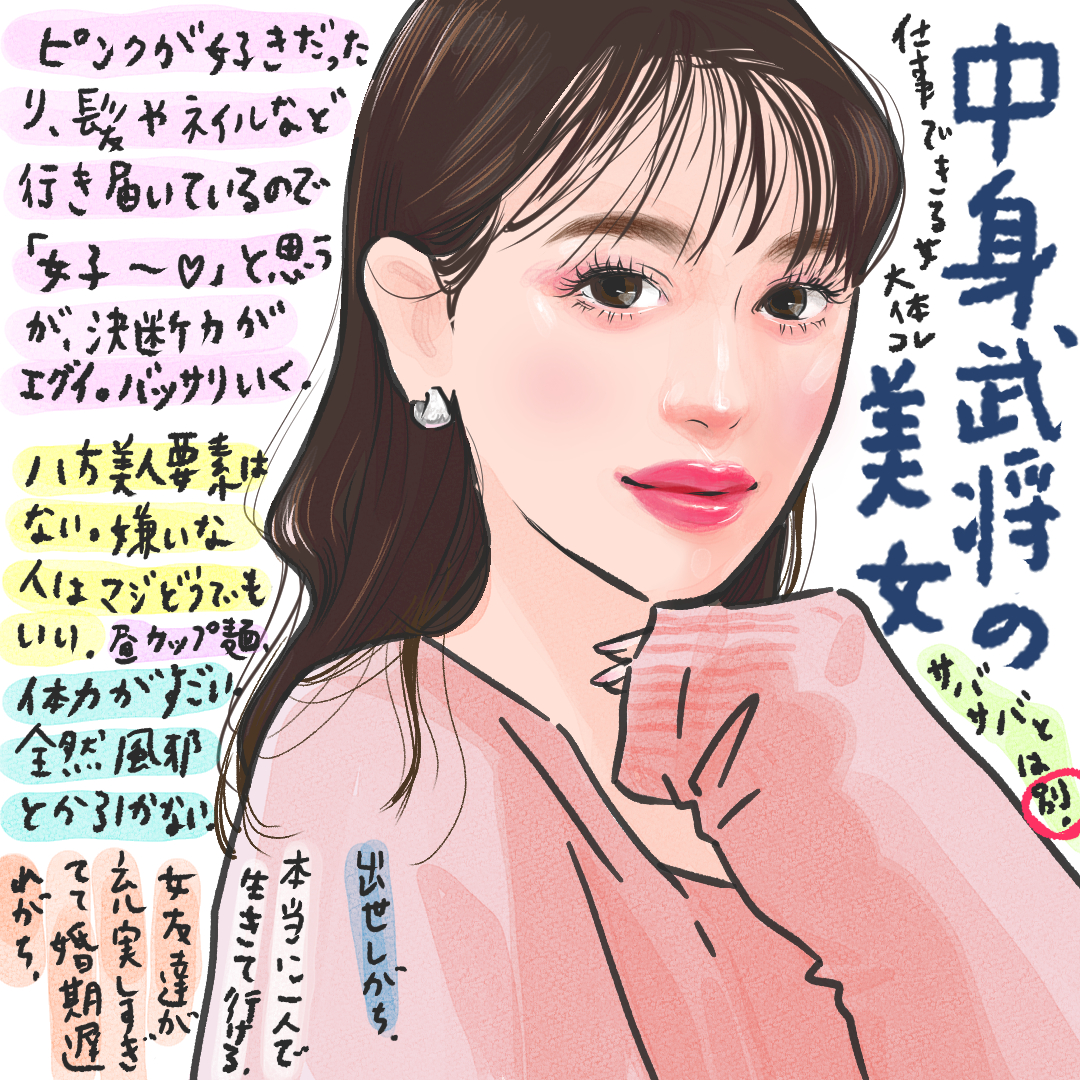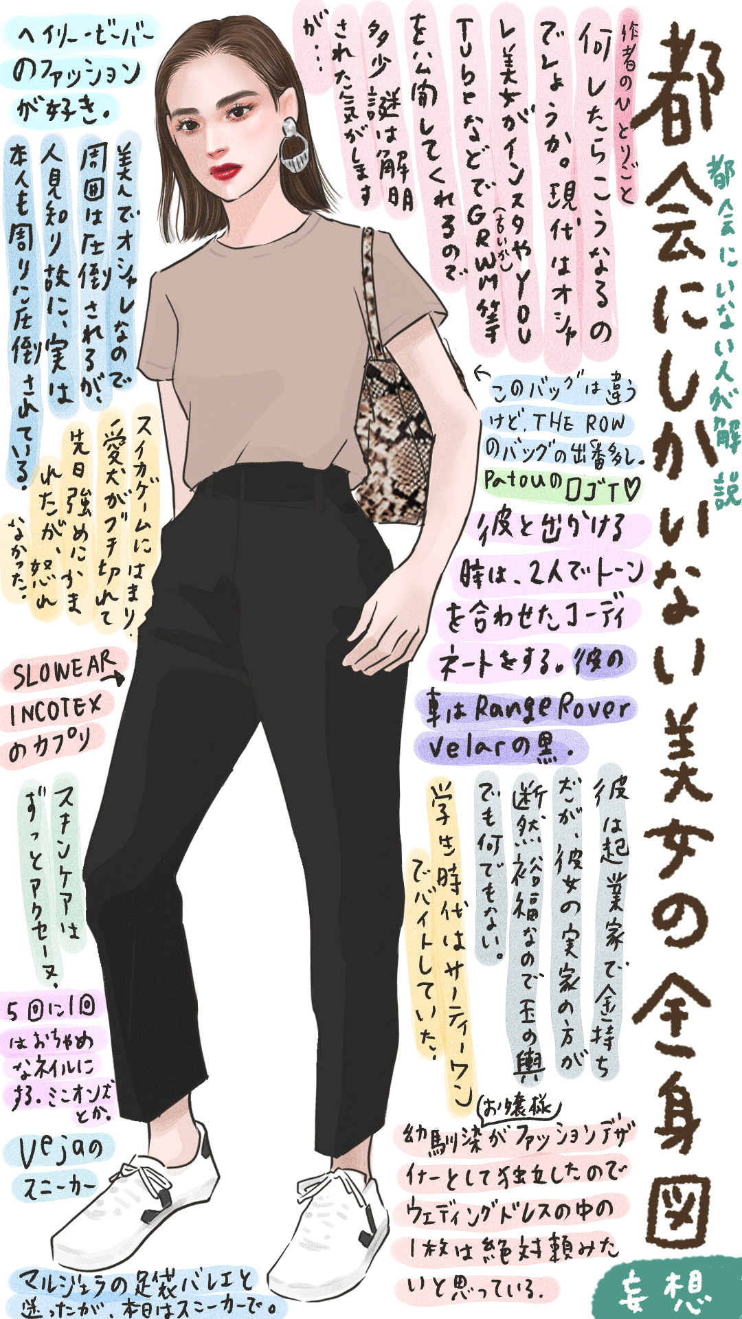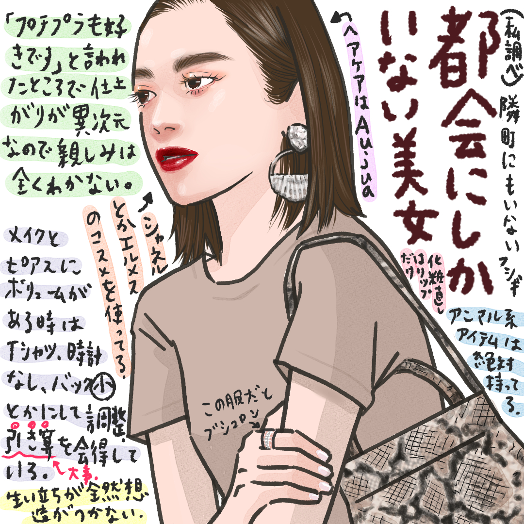都内の裕福な家庭で育った設定で妄想してみましたが、都会育ちはむしろ地味だよ!とかオシャレな人は他の土地から出勤してくるよ!といった情報をいただきましたので、いずれ「都会の美女通勤バージョン」も描きたいと思っています。