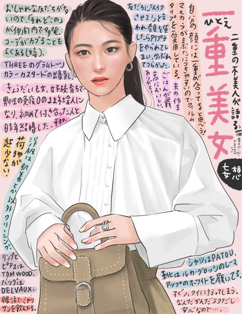 今回の美女は、一重エピソードがほぼ皆無なのですが・・お嬢様育ちの若い人妻設定で描きました。