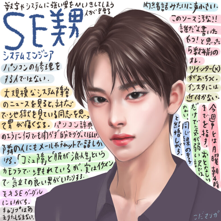 こだマンガ妄想シリーズ SE(システムエンジニア)美男 妄想でシステムエンジニア美男を描いてみました!SEはシャイで地味なイケメンがいるのでよく見てね!! 2024.05.23 2 こだマンガ妄想シリーズ